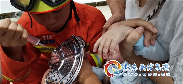 本網訊 6月29日上午,一名女子急匆匆抱著1歲的女孩來到天柱縣擎天路消防救援站尋求幫助,說當時她正在做飯,小孩子獨自一個人玩耍,不小心把手插進了蒸盤里面的小孔,卡住取不下來了,想了很多方法均未得到有效處理,孩子的手指已經變得紅腫。