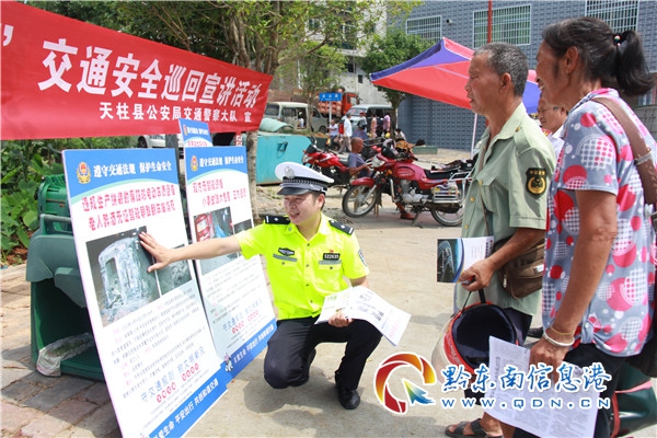 本網訊 7月6日,天柱縣公安局交警大隊民警針對夏季農村道路交通事故高發的嚴峻形勢,積極利用村鎮趕集日走進集市與群眾開展主題為“美麗鄉村安全行”的交通安全宣傳活動。