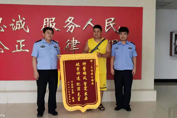 7月10日,蔣先生來到天柱縣公安局刑偵大隊值班室,將一面印有“神警雄風 雷霆出擊 破案神速犯罪克星”的錦旗交到辦案民警手中,對民警為民解憂、快速破案表達誠摯感謝。