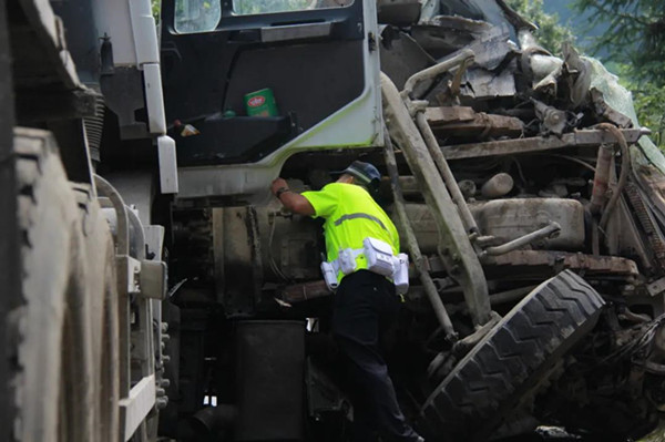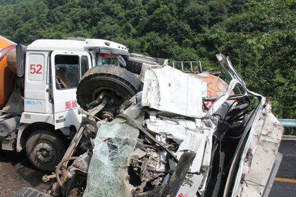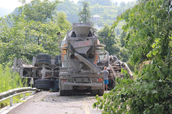 就在駕駛員楊師傅的車輛發生側翻后,楊師傅還在暗自慶幸自己系好了安全帶,沒有在側翻過程中被甩出車外的時候,危機再次降臨,后方另外一名駕駛員黃師傅駕駛同樣的泥罐車正向該路段駛來,而且因為駕駛員黃師傅所駕駛的車輛在經過連續轉彎和下坡后,剎車系統也略有失控,在避無可避的情況下撞上了前方楊師傅所側翻的水泥罐車,在兩車相撞時,還困在車內的楊師傅再次被安全帶牢牢的保護在了自己的車內,沒有造成被甩出車外的危害。