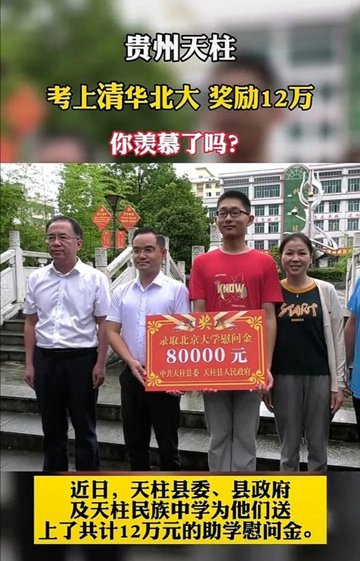 對于每年考取清華北大的考生,縣委、縣人民政府許諾每人獎(jiǎng)勵(lì)8萬元人民幣,同時(shí)學(xué)校另外還獎(jiǎng)勵(lì)每人4萬元。2021年考取清華北大的弓政和游謙兩位同學(xué)享受這一榮譽(yù),獲得獎(jiǎng)勵(lì)12萬元人民幣,領(lǐng)獎(jiǎng)儀式在天柱民族中學(xué)舉行,通過縣電視臺(tái)報(bào)道,全縣群眾紛紛點(diǎn)贊,激勵(lì)了全縣更多學(xué)子在未來的求學(xué)生涯中更加努力拼博,爭做國家的棟梁之材。