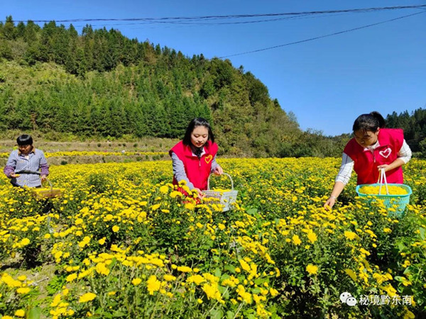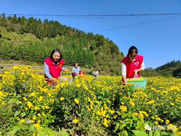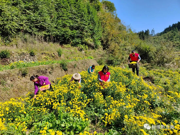 花田里,黨員志愿者與村民們來回穿梭,一只手穩穩地端著籃筐,另一只手嫻熟、麻利地采摘功夫菊,不到一分鐘就摘滿一大把放到籃子里,再倒進大袋子中,進行裝車、運輸,花農們將所采摘的功夫菊花運送到收購點進行稱重,相互間談論著誰家的花朵開得大,誰家的花摘得多,誰家這次賣的錢多……。