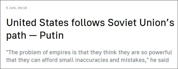 " 美國正以自信且堅定的步伐,走在蘇聯的老路上 "。當地時間 6 月 4 日,俄羅斯總統普京在參加年度經濟論壇——圣彼得堡國際經濟論壇期間,對媒體直言不諱地指出,美國正犯下一個典型的問題:對自己無限實力充滿信心,給自己制造無法應對的問題,就像曾經的蘇聯那樣。