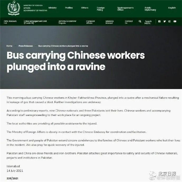 巴基斯坦外交部在聲明中表示,巴外交部正與中國大使館保持密切聯系,協作配合。聲明說,巴基斯坦政府和人民向在事故中喪生的中巴工作人員的家屬表示誠摯的慰問。我們也祈禱傷者早日康復。