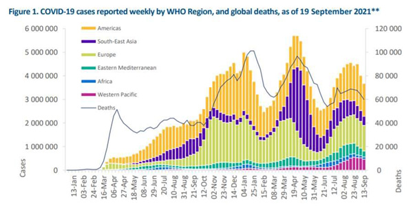 當地時間 9 月 21 日,世衛組織發布新冠肺炎每周流行病學報告,上周全球新冠肺炎新增確診病例超過 360 萬例,新增死亡病例近 6 萬例,與前一周相比均繼續下降。除非洲區域新增確診病例數量增加,其他區域新增病例均出現下降。全球新增死亡病例數量較前一周下降 7%,除西太平洋區域和歐洲區域新增死亡病例增加,其他區域新增死亡病例均出現下降,東南亞區域降幅達 27%。