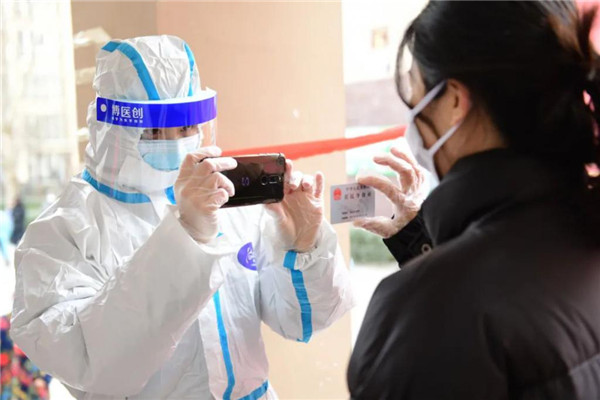 △ 16 日,石家莊新樂市一小區,醫護人員正在為居民身份證進行拍照上傳核酸檢測信息。