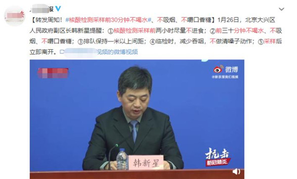 1 月 26 日,北京大興區人民政府副區長韓新星提醒: