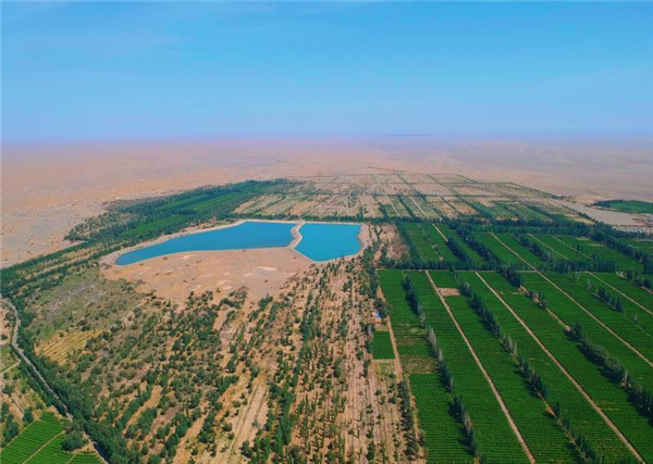 2019 年 8 月 5 日,航拍鏡頭下的敦煌陽關林場。敦煌自然資源局供圖