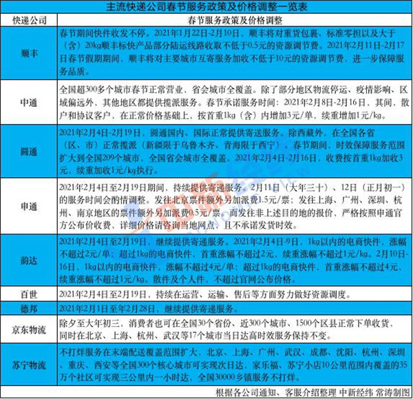 除了保證 " 春節(jié)不打烊 ",中新經(jīng)緯記者注意到,目前大部分快遞公司調(diào)整了春節(jié)期間資費(fèi)。