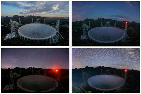 2019 年 8 月 28 日拍攝的不同光線環境下的 " 中國天眼 "(拼版照片,檢修期間拍攝)。新華社記者 歐東衢 攝
