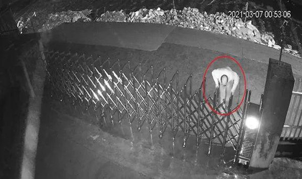 視頻中,這名男子鬼鬼祟祟站在公司門口,隨后快速越過電動伸縮門進入公司,并消失在畫面中。