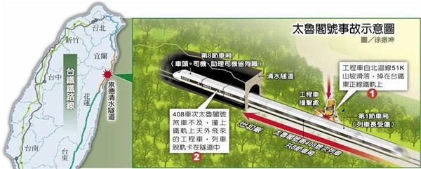 臺鐵局副局長馮輝升 2 日晚間 7 點說明 " 太魯閣號 " 事故,初步查明事故原因是臺鐵局委外邊坡整治北回線 K51+170~500 山側邊坡安全防護工程,施工廠商東新營造公司工地主任早上約 9 點駕駛貨車巡視工地,將貨車停在工務所前,疑似貨車因手剎未拉緊,由停車處溜逸 20 公尺,滑至軌道上約北回線東正線 K51+250 處,并于 2 日上午 9 點 28 分遭 " 太魯閣號 "408 次撞擊。詳細原因,運安會已會同鐵道局至現場調查中。運安會方面指出,后續還要進一步了解,負責人楊宏智表示,現場沒看到天氣因素,會調查人為因素與機械因素,機械因素可能包括工程車的手剎車,是根本沒有拉還是有拉,但剎車系統不到位,都可以從車輛殘骸中做判斷。