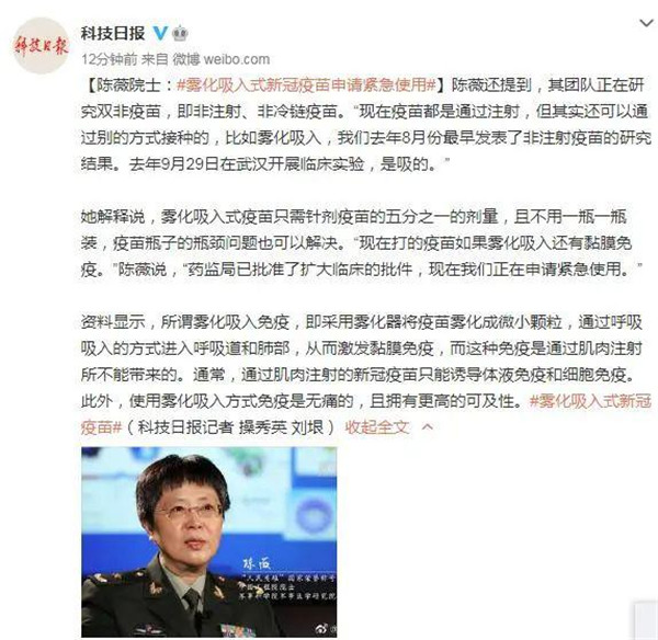 陳薇還提到,其團(tuán)隊(duì)正在研究雙非疫苗,即非注射、非冷鏈疫苗。" 現(xiàn)在疫苗都是通過注射,但其實(shí)還可以通過別的方式接種的,比如霧化吸入,我們?nèi)ツ?8 月份最早發(fā)表了非注射疫苗的研究結(jié)果。去年 9 月 29 日在武漢開展臨床實(shí)驗(yàn),是吸的。"