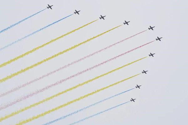 由飛機排列組成的巨大的 "100""71" 字樣掠過長空,15 架殲 -20 飛機組成 3 個梯隊呼嘯而過,教練機拉出 10 道彩煙。