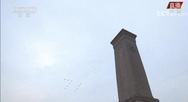 雄鷹翱翔,飛機編隊破空而來,直升機懸掛中國共產黨黨旗飛過天安門上空。