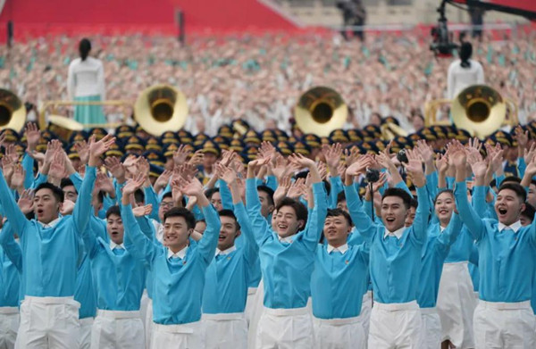 今天的慶祝大會結束了,人們一遍一遍唱著《歌唱祖國》,久久不愿離去。