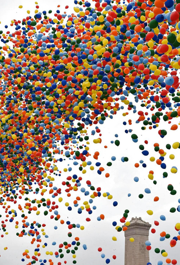 和平鴿展翅高飛,氣球騰空而起,全場上下共同唱起《歌唱祖國》。