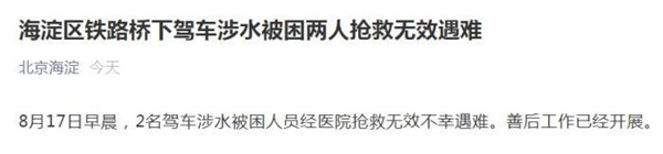據 " 北京海淀 " 微信公眾號發布的消息,8 月 17 日早晨,2 名駕車涉水被困人員經醫院搶救無效不幸遇難。善后工作已經開展。