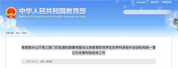 記者昨天(9月7日)從教育部網站獲悉,為貫徹落實中共中央辦公廳、國務院辦公廳印發的《關于進一步減輕義務教育階段學生作業負擔和校外培訓負擔的意見》(以下簡稱“雙減”文件),教育部會同民政部、市場監管總局印發通知,就將面向義務教育階段學生的學科類校外培訓機構統一登記為非營利性機構工作進行部署。