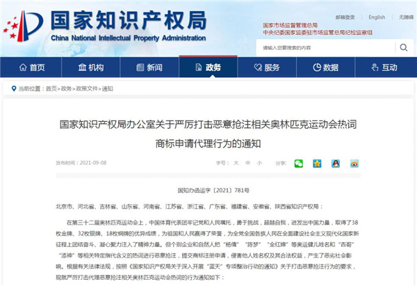 據國家知識產權局網站消息,9 月 8 日,國家知識產權局官網發布通知,要求北京、河北、吉林、山東、河南、江蘇、浙江、廣東、福建、安徽、陜西等 11 省(市)知識產權局嚴厲打擊代理惡意搶注相關奧林匹克運動會熱詞的行為,對前期通報的涉 " 楊倩 "" 陳夢 "" 全紅嬋 " 等奧運健兒姓名的商標注冊申請 109 件的代理機構立即組織調查,情節嚴重的,報請國家知識產權局依法停止受理其辦理商標代理業務。具體情況如下: