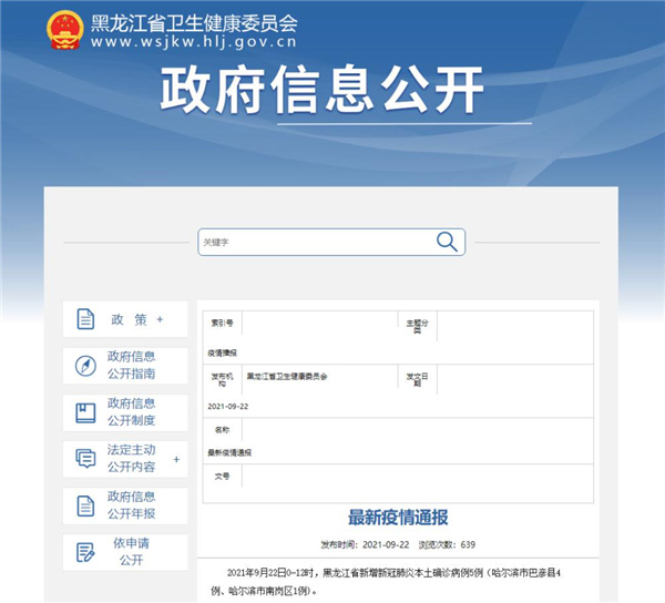 2021 年 9 月 22 日 0-12 時,黑龍江省新增新冠肺炎本土確診病例 5 例(哈爾濱市巴彥縣 4 例、哈爾濱市南崗區 1 例)。