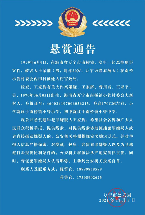 經(jīng)查,王家輝有重大作案嫌疑。王家輝,曾用名:王亞平,男,1970 年 6 月 5 日出生,海南省萬寧市南橋鎮(zhèn)小管村委會大新村人,身份證號 460024197006056215,身高 170 厘米左右,小學(xué)就讀于南橋鎮(zhèn)小管小學(xué),初中就讀于南橋鎮(zhèn)小管中學(xué)。