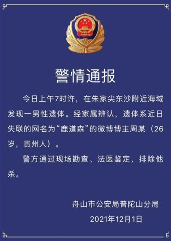 經(jīng)進一步搜尋,舟山警方于12月1日7時許發(fā)現(xiàn)其遺體。警方通過現(xiàn)場勘查、法醫(yī)鑒定,排除他殺。