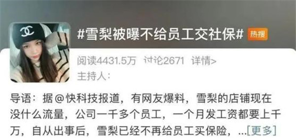 10日上午,多家媒體發布微博稱,“有網友爆料,雪梨的店鋪現在沒什么流量,公司一千多個員工,一個月發工資都要上千萬。自從出事后,雪梨已經不再給員工買保險,很多人都跑去投訴了。在員工的社保方面,甚至是空白的狀態。”
