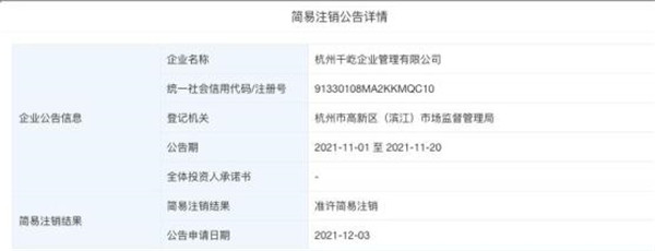 值得注意的是,12月3日,由雪梨任執行董事的杭州千屹企業管理有限公司注銷,注銷原因為決議解散。股權穿透圖顯示,該公司由杭州辰范網絡科技有限公司和蘇超然共同持股。