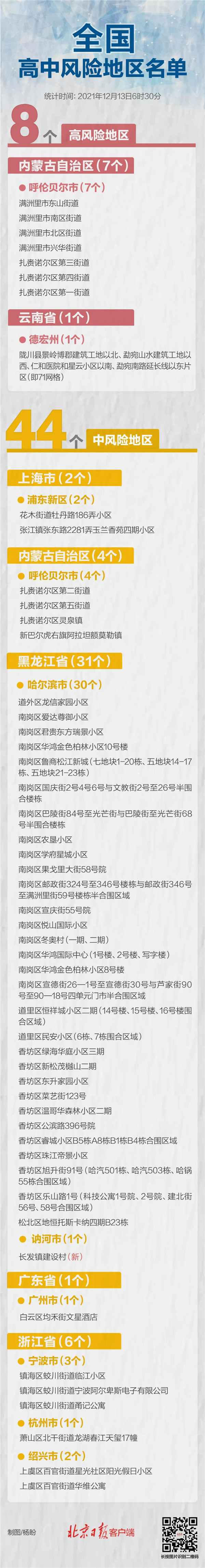 根據國務院聯防聯控機制有關規定,經專家組綜合評判,黑龍江省訥河市疫情防控指揮部決定,自2021年12月13日6時起將長發鎮建設村調整為中風險地區,其他地區風險等級不變。最新統計顯示,全國現有高風險地區8個、中風險地區44個。