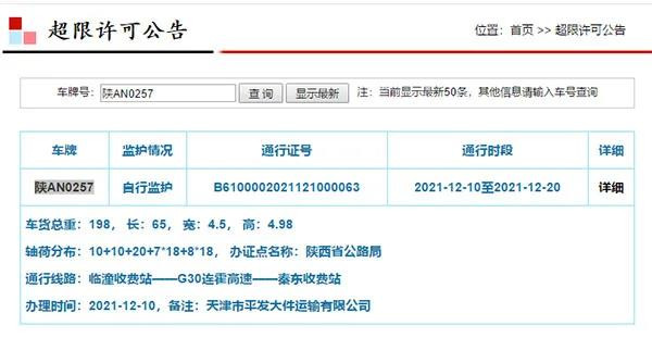 該車于12月10日在陜西省公路局辦理的超限許可顯示,其監護方式為自行監護,通行路線為“臨潼收費站——G30連霍高速——秦東收費站”,通行時段為2021年12月10日至2021年12月20日。車貨總重198噸, 長65米, 寬4.5米, 高4.98米。系天津市平發大件運輸有限公司車輛。其所運貨物為換熱器油箱,貨物重量為184噸。