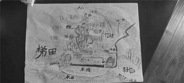 在這份手繪圖中,他的家附近有學(xué)校、公路、水塘、水田、梯田、旱地、竹林、水牛、廣柑等。李景偉表示,當(dāng)?shù)赜蟹N疑似沙葛的白色圓形地瓜,剝掉皮生吃很甜。山上還有毛竹、竹筍。家里有石磨,堂屋最里邊靠左有一個丁字形木架上用繩子吊著推磨,“記憶中沒見過下雪,當(dāng)?shù)赜腥损B(yǎng)大批的鴨子。”