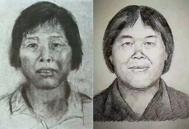 “梅姨”的模擬畫像。左圖為廣州警方公布,右圖為畫像專家林宇輝繪制。