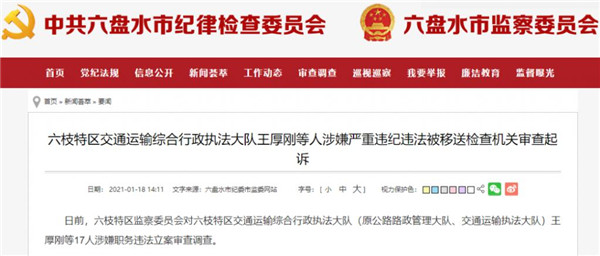 日前,六枝特區(qū)監(jiān)察委員會(huì)對(duì)六枝特區(qū)交通運(yùn)輸綜合行政執(zhí)法大隊(duì)(原公路路政管理大隊(duì)、交通運(yùn)輸執(zhí)法大隊(duì))王厚剛等 17 人涉嫌職務(wù)違法立案審查調(diào)查。