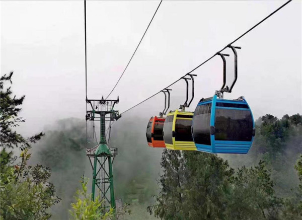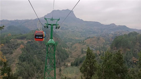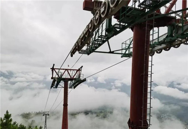 據(jù)了解,印江大圣墩客運(yùn)索道全長(zhǎng) 2819 米,高差 453 米,支架 18 個(gè),最高離地 60 米,索道共 30 個(gè)車(chē)廂,目前為止,是全國(guó)最長(zhǎng)的單線循環(huán)脈動(dòng)固定抱索客運(yùn)架空索道。