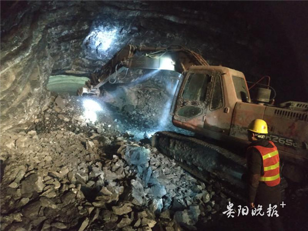 ▲隧道進口方向,挖掘機工作人員正在用破碎錘施工