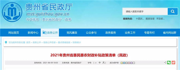 6月9日,貴州省民政廳發布“2021年貴州省惠民惠農財政補貼政策清單(民政)”。