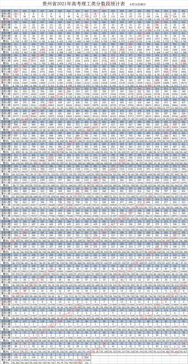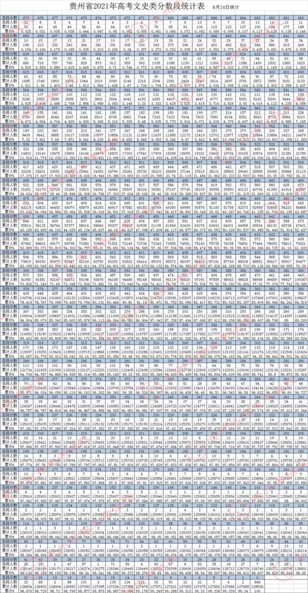 貴州省 2021 年高考文史、理工類分數段統計表公布,如下: