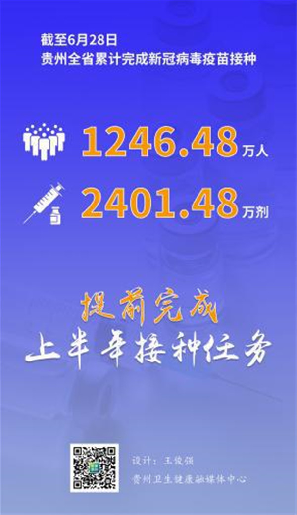 6 月 30 日,記者從貴州省衛(wèi)健委獲悉,截至 6 月 28 日,貴州全省累計完成新冠病毒疫苗接種 1246.48 萬人、2401.48 萬劑,提前完成上半年接種任務(wù)。