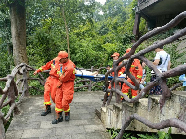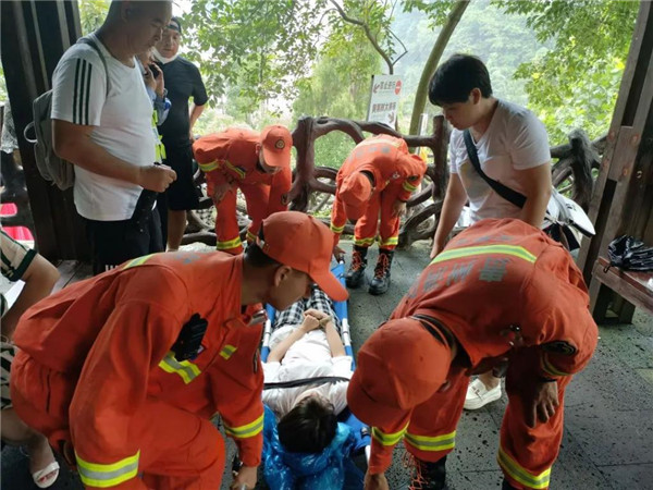 由于景區內的道路全是蜿蜒山路,救援人員只能步行。消防員趕到現場后,中暑女孩已經恢復意識,但是身體非常虛弱,無法行走。為爭取救援時間,消防指戰員立即將傷患轉移至救援擔架上,在景區管理人員的協力配合下火速將傷患運送至往景區醫療救助站進行進一步治療。10 多分鐘后,消防員成功將傷患運送至救助點,經現場醫務人員全面的檢查治療后,傷患漸漸恢復意識。