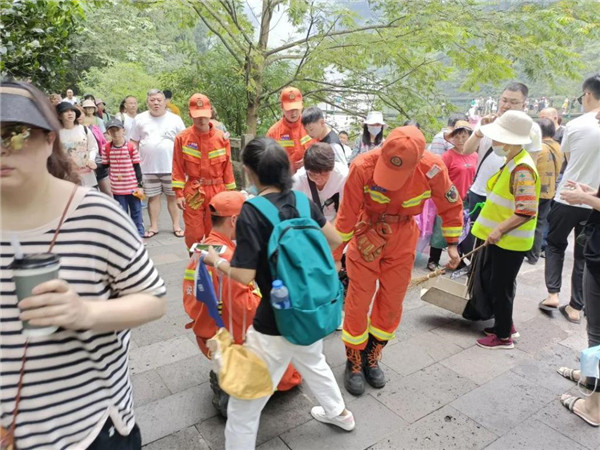 7 月 24 日 13 時 50 分,位于安順市黃果樹大瀑布一號觀景臺三岔路口處一名 19 歲女孩在游覽過程中,因身體突感不適中暑昏倒,情況緊急。接到求助信息后,黃果樹消防大隊景區執勤服務站執勤人員立即攜帶救生器材趕忙現場緊急救助。
