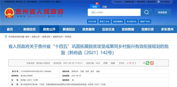 一、原則同意《貴州省 " 十四五 " 鞏固拓展脫貧攻堅(jiān)成果同鄉(xiāng)村振興有效銜接規(guī)劃》,由你們印發(fā)并認(rèn)真組織實(shí)施。