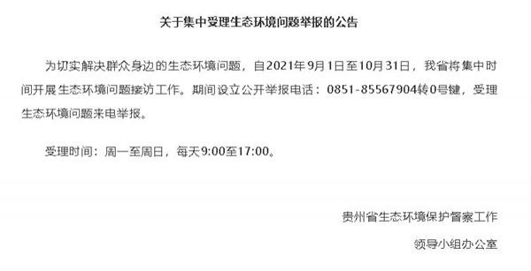 近日,貴州省生態環境廳官網發布了關于集中受理生態環境問題舉報的公告。