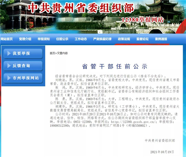 胡建華,男,漢族,1966年3月生,研究生(工學博士),中共黨員,現任貴州省大數據發展管理局副局長、黨組成員,省信息中心黨委書記,擬任省直單位正職。