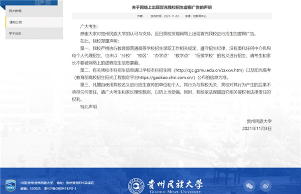 11 月 3 日,記者從貴州民族大學獲悉,近期學校發現網絡上出現一些冒充學校進行招生的虛假廣告,特發布此公告,以防廣大考生和家長上當受騙。