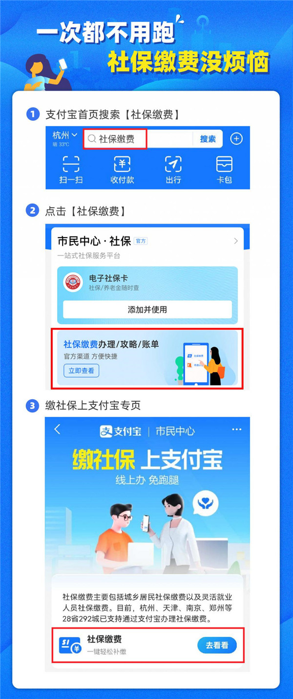 目前,包括貴陽、杭州、天津、南京、鄭州等全國28省292城已支持通過支付寶辦理社保繳費。除社保繳費功能以外,支付寶市民中心社保頻道還可以進行社保轉移申請、全國失業金申領、社保證明打印、社保待遇資格認證等功能。