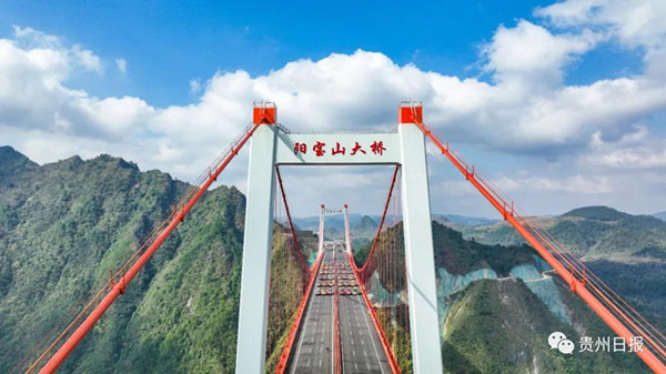 陽寶山特大橋位于黔南自治州貴定縣新巴鎮和德新鎮境內,大橋全長1112米,主跨650米,為單跨鋼桁梁懸索橋,是貴黃高速公路控制性工程。