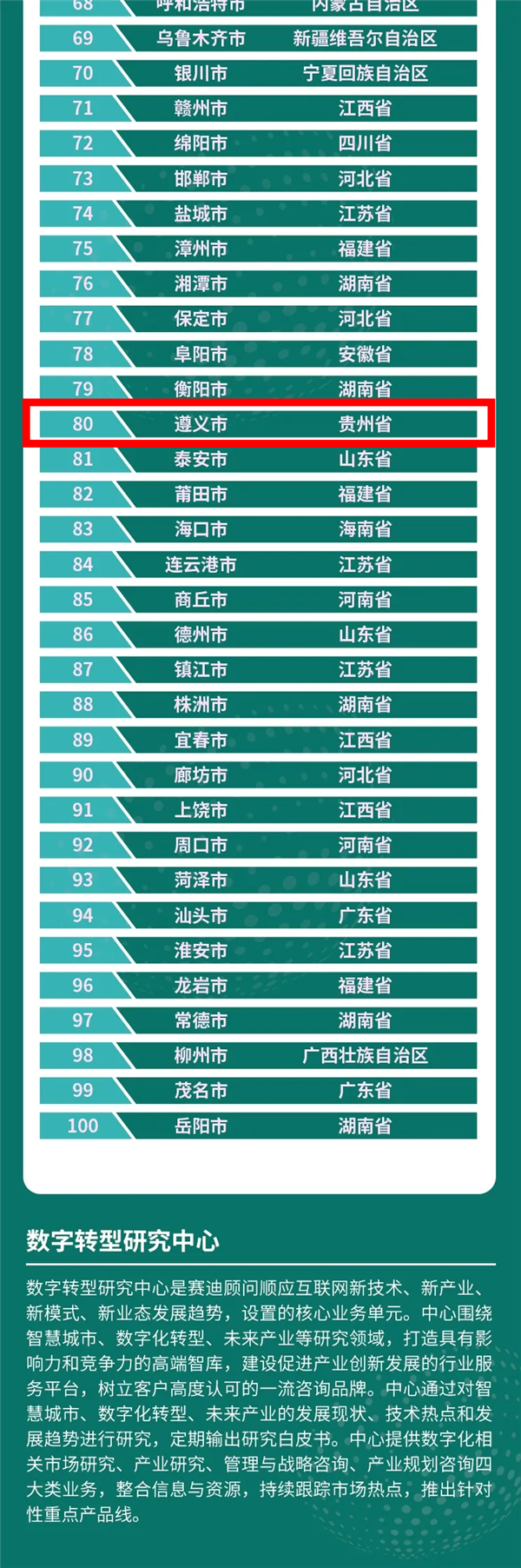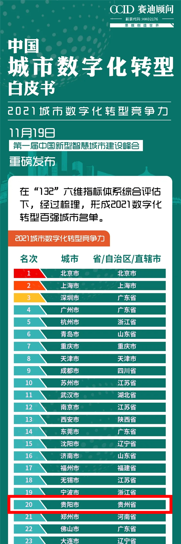 據了解,此次,發布機構通過調取數據、分析調研等,從信息基礎、城市治理、社會服務、產業經濟、創新保障、低碳發展等六個維度的指標體系,對全國城市數字化轉型能力進行了全面評估,并將數字化轉型百強城市分為三個梯隊,其中第一梯隊包含北京、上海、深圳、廣州、杭州5個城市,得分均在70分以上,城市整體數字能力全國領先,處于生態構建、創新發展階段,代表著我國城市數字化轉型的領先水平。其中,貴陽市排名20,作為第二梯隊,被劃分為強力增長區,是中國城市數字化轉型的有力支撐。