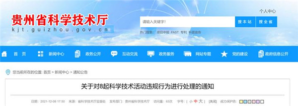 根據(jù)《科學(xué)技術(shù)活動違規(guī)行為處理暫行規(guī)定》(科學(xué)技術(shù)部令第19號)《科研誠信案件調(diào)查處理規(guī)則(試行)》(國科發(fā)監(jiān)〔2019〕323號)《貴州省科研誠信管理暫行辦法》(黔科通〔2020〕9號)的有關(guān)規(guī)定,通過對有關(guān)投訴舉報及線索移交的科學(xué)技術(shù)活動違規(guī)行為案件的調(diào)查,決定對以下8家單位及法定代表人(原法定代表人)的科學(xué)技術(shù)活動違規(guī)行為進(jìn)行處理,其科研失信信息納入貴州省科研誠信信息系統(tǒng)。