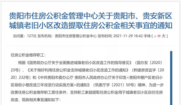 11月29日,貴陽市住房公積金管理中心發布關于貴陽市、貴安新區城鎮老舊小區改造提取住房公積金相關事宜的通知,進一步改善住房公積金繳存職工居住條件,支持職工家庭提取住房公積金用于城鎮老舊小區自住住房改造。詳情如下: